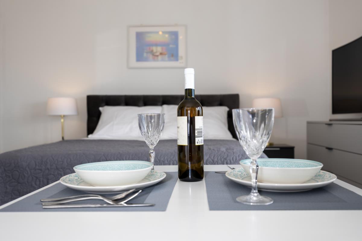 Studio apartman Iva s pogledom na more. Apartman za dvije osobe s bračnim krevetom, kupaonicom s tušem, balkonom s pogledom na more, UHD TV, potpuno opremljena kuhinja i stol za objedovanje s pogledom na more. Spavaća soba s bračnim krevetom, potpuno opremljena kuhinja, kupaonica, UHD TV sa zaobljenim ekranom, kupaonica, balkon.
